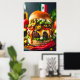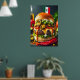 Get ready for a flavour explosion with this Sonora Spice Bomb burger. A thick spiced beef patty, grilled to savory perfection, is topped with melted Oaxaca cheese, roasted jalapeños, a generous smear of chipotle mayo, and fresh avocado. All nestled inside a toasted corn-dusted bun. A small Mexican flag adds a festive touch, while a blurred background hints at chili peppers and fresh cilantro, completing this Mexican culinary delight.