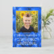 Child's birthday party invitation with blue balloons design. Add son's photo to a square frame surrounded by party balloons in pretty blue colour. White text is bold for his name and age, with all party information added in a paragraph. Balloons are also on the back of the invitation, which is available as an instant download to share online.