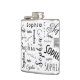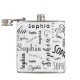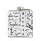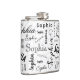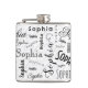 A typography custom name flask for Sophia's favourite drink.. The initial script "S" makes a decorative pattern in the background. Her name features a mixture of fun lettering and striking contrasting colours of black, white and grey. This personalized makes a great gift choice for any occasion that calls for high spirits.