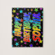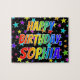 This exciting and lively birthday-themed jigsaw puzzle design features the message "HAPPY BIRTHDAY, SOPHIA" with the characters having a colourful rainbow spectrum inspired gradient pattern, in addition to a fun field of stars background pattern. A vibrant puzzle like this might be a fun way to acknowledge the birthday of somebody named Sophia. [~Z0000468]