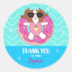 These stickers feature an illustration of Sophie, a dog cartoon character, relaxing on her doughnut shaped inflatable pool float. Sophie is a brown and white dog that is wearing a pineapple bathing suit. She is wearing sunglasses. The doughnut inflatable float has bright pink frosting with colourful sprinkles in mint green, purple, yellow and darker pink. The sticker has wavy line design and sparkle accent. "Thank You" is in a balloon shaped font, and the signature portion for the name is in pink.