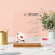 This elegant wedding menu card features a sophisticated layout with the phrase "the DRINKS" in stylish script at the top, followed by neatly organized sections for beer, wine, and spirits. The design includes a minimalist floral illustration of a peony in soft pink tones on a wooden base, adding a touch of natural beauty to the overall aesthetic. With a clean color palette of black, white, and light gray, this menu exudes a refined and luxurious mood, perfect for an upscale event. The combination of classic typography and delicate botanical elements creates an inviting atmosphere, making it ideal for couples seeking a chic and polished presentation for their special day.