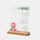 This elegant wedding menu card features a sophisticated layout with a clean, modern design. The color palette includes a deep black background contrasted by vibrant green and soft pink floral elements, creating an inviting atmosphere. The typography is simple yet stylish, using sans-serif fonts for clarity and cohesion across sections labeled BEER, WINE, and SPIRITS. Delicate illustrations of pink peonies add a touch of natural beauty, enhancing the refined aesthetic perfect for a chic celebration.