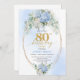 Celebrate a remarkable milestone with this 80th birthday invitation featuring one of today’s most trendy and elegant color combinations: blue and gold. Designed with soft watercolor blue hydrangeas, fresh eucalyptus greenery, and refined gold floral accents, this invitation brings a sense of calm sophistication and joyful celebration to an unforgettable occasion.