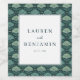 These elegant wedding wine labels feature a sophisticated botanical theme with a dark green background adorned by stylized leaf motifs in a grid pattern. The central white square, framed by a thin black line, showcases classic serif typography for the names and date, creating a refined and harmonious look. Perfect for celebrating your special day, these labels convey a mood of tranquillity and renewal, making them an ideal choice for couples looking to add a touch of nature-inspired elegance to their wedding favours.