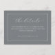 This wedding enclosure card features a minimalist and elegant design with a solid grey background framed by a thin white border. The layout is clean, emphasizing simplicity with ample negative space around the centred text elements. The typography combines an elegant cursive script for "the details" with a simple sans-serif font for additional information, creating a sophisticated yet clear aesthetic. Perfect for conveying essential event details, this card exudes a mood of sophistication and clarity, making it ideal for modern weddings that value organization and understated elegance.