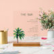This acrylic sign features a minimalist design with a vibrant illustration of a palm tree on the left, set against a clean white background. The layout is organized and modern, showcasing "THE BAR" in bold serif font at the top, followed by neatly categorized lists of beer, wine, and spirits in a sans-serif typeface. The color palette is simple, using black text with the natural hues of the palm tree adding a touch of tropical flair. Ideal for bars or restaurants, this sign conveys a professional yet inviting atmosphere, perfect for displaying drink options in an elegant manner.
