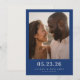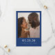 This wedding save the date card features a modern and elegant design with a clean, minimalist layout. The top two-thirds display a photograph of a couple, framed by a navy blue border that contrasts beautifully with the lighter tones in the image. Below the photo, the bottom third is dedicated to text set against the same navy background, using a simple serif font for a sophisticated look. The overall aesthetic is refined and contemporary, perfect for setting the tone for an upcoming celebration.