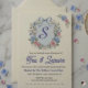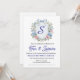 Elevate your next sophisticated garden gathering, ladies' luncheon, or bridal shower with this exquisite, watercolor-illustrated invitation. The design features a delicate light blue and pink floral wreath composed of lush hydrangeas, roses, and lush greenery, centered around a classic watercolor crest shield. At the top of the crest sits a charming light blue ribbon bow.