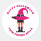 Jolie sorcière fashionista avec un casquette de sorcière rose chic, bas rayés et chaussures de sorcière noire avec lacets violets attachés dans un arc. Parfait pour une école ou un foyer, la fête d'Halloween favorise. Une chauve-souris décore son casquette.