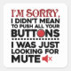 Funny and cute funny saying in modern black and red typography. The text on the button says "I'm Sorry I Didn't Mean To Push All Your Button. I Was Looking For Mute" Perfect for anytime of the year and makes a great gift for someone with a good sense of humour