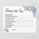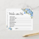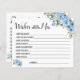Blue Flowers Souhaite que le prochain jeu de nuptiale de la carte de Mme Game soit inclus (avant et arrière). Modifier le libellé de la conception pour les versions anglaise et espagnole. Pour une personnalisation supplémentaire (changement de libellé, couleur de police, style de police ), cliquez sur personnaliser, faites défiler vers le bas et cliquez sur le lien "cliquer pour customiser plus loin". COMMENT JOUER : L'invité remplira la carte après la formulation fournie pour partager son meilleur conseil pour le Bientôt être Mme.