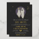 Joining souls with your soulmate? Invite your guests with this hauntingly cute and romantic wedding invitation with a pair of ghosts staring adoringly at one another. The ghost bride wears a pretty gold foil crown and the ghost groom a bow tie with gold foil details. They stand beneath a starry sky with a crescent moon printed with gold foil.