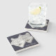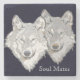 Stylish stone coaster with graphics of the faces of two grey wolves, on a dark blue background. White text reads Soul Mates and can be personalized to read what you want. Great gift idea for any couple.