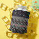 Colour image of many buttons on a sound mixer in a recording studio.