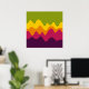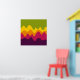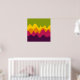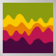 A design made up of irregular wave or hill like shapes arranged like a landscape with a progression of bands one behind or on top of another abstractly playing with colour and space. The design is also very reminiscent of sound and music with the wave like shapes and harmonising colours.