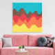 A design made up of irregular wave or hill like shapes arranged like a landscape with a progression of bands one behind or on top of another abstractly playing with colour and space. The design is also very reminiscent of sound and music with the wave like shapes and harmonising colours.
