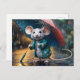 Une petite souris joyeuse est sous la pluie avec un grand parapluie. On voit partout des gouttes de pluie, des flaques et des reflets colorés.