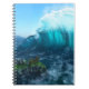 Une vague massive saute des mers agitées, brillant blanc et bleu et turquoise dans la lumière du soleil. Sous la vague, sur le point d'être submergée, se trouve une petite ville avec un château et des cottages médiévaux construits sur un promontoire rocheux.