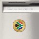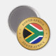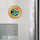 The South African flag is inset into a rounded faux gold ring. The words "South Africa" feature at the top and bottom of the design, and are of a pressed effect. The pair of three decorative stars across from each other, are also designed with a pressed effect.