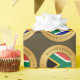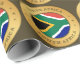 The South African flag is inset into a rounded faux gold ring. The words "South Africa" feature at the top and bottom of the design, and are of a pressed effect. The pair of three decorative stars across from each other, are also designed with a pressed effect.