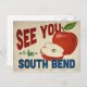 A charming South Bend Indiana vintage travel postcard featuring a lovely red apple, along with fun retro style text that says, "See you in South Bend"