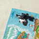 A spectacular cartoon of Southern California – showcasing Los Angeles, Anaheim, Long Beach, San Diego and many other cities plus most beaches. This bright and charming scene has it all – a surfer hangs ten while a mermaid lounges on a rock, a killer whale leaps out of the water, a muscular beach couple both flex to impress, zoo animals wait for tourists and a bull smashes into a bull fighter, all beneath the bright California sun shining high above it all.