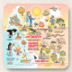 Bright and colourful scene offers a spectacular view of Southern California - wacky characters frolic on the beach and desert of SoCal showcasing Los Angeles, Orange County, San Diego, Santa Barbara, Riverside, Palm Springs, El Centro, Salton Sea, Anza Borrego and Joshua Tree parks as well as the border cities of Tijuana, Tecate and Mexicali. This charming scene has it all – a surfer hangs ten while a killer whale leaps out of the water, zoo animals smile for the camera, wine lovers make a toast as a hiker is noticed by a UFO and much more…