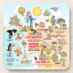 Bright and colourful scene offers a spectacular view of Southern California - wacky characters frolic on the beach and desert of SoCal showcasing Los Angeles, Orange County, San Diego, Santa Barbara, Riverside, Palm Springs, El Centro, Salton Sea, Anza Borrego and Joshua Tree parks as well as the border cities of Tijuana, Tecate and Mexicali. This charming scene has it all – a surfer hangs ten while a killer whale leaps out of the water, zoo animals smile for the camera, wine lovers make a toast as a hiker is noticed by a UFO and much more…