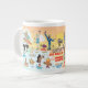 Bright and colourful scene offers a spectacular view of Southern California - wacky characters frolic on the beach and desert of SoCal showcasing Los Angeles, Orange County, San Diego, Santa Barbara, Riverside, Palm Springs, El Centro, Anza Borrego and Joshua Tree parks as well as the border cities of Tijuana, Tecate and Mexicali. This charming scene has it all – a surfer hangs ten while a killer whale leaps out of the water, zoo animals greet the tourists, wine lovers make a toast as a hiker is noticed by a UFO and much more…