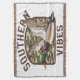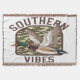 This white blanket features a detailed illustration of a mallard duck in flight, set against a camouflage background within an arched frame. The text "SOUTHERN" is arched above the graphic, and "VIBES" is placed below in a simple, bold font. The design suggests an appreciation for wildlife and a Southern lifestyle.