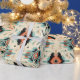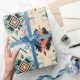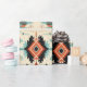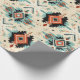 Southwestern wrapping paper in desert blues and terracotta, highlighted by tribal feathers and motifs.