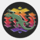 An American southwest desert dwelling green speckled gecko crawls across a rainbow coloured southwest fabric design.