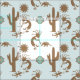 Fun Southwest pattern with Kokopelli playing flute, cactus, lizards and armadillo under a stylized sun. Aqua Blue background. Design is part of the Southwest Pastels collection. Main previews do not reflect actual colour (colour looks faded in them). For more accurate view of this design colour click on the end option, the tile preview.