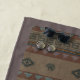 Native American, Southwestern Aztec design is in a variety of shades of tans, browns, rusts and blues. There are faux leather braided ties going across with silver conchos on either side.