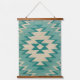 This is a fabric wall tapestry with a print of a Navajo geometric pattern. The colours are teal hues. NOTE: The tapestry is NOT woven, it is photo art of a woven design. The tapestry is trimmed with wooden top and bottom rails.