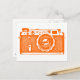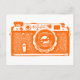 A postcard with a high contrast image of a vintage Soviet Russian range finder camera from the 1950s/60s.