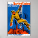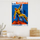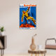 See the Soviet Union In The Making on a vintage travel poster reproduction. A retro graphic of a man seated on a crane hook with an industrial background.