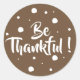 Quelques autocollants minimalistes marron Thanksgiving disant : "Soyez reconnaissants !" en lettres blanches et entourés de pois blancs de différentes tailles, © ArianeC Illustrations