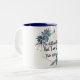 Des fleurs bleues croustillantes et un cadre doré entourent la belle Écriture Psaume 46:10 sur cette tasse à deux tons; prêt pour vos matins tranquilles de café avec Jésus.