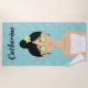 Destei's cartoon illustration of a spa woman. The woman has black hair that is on a bun and there is a tropical white frangipani flower next to the bun. The woman is wearing a white towel over her body and she has cucumber slices over her eyes. Next to the woman there is a white shelf that has massage stones on it together with two white candles. Under the shelf there are two green bamboo plants bringing even more spa look to the design. The background is a fun teal blue tile pattern. There is also a personalizable text area for a name.