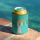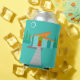This Personalized Space Age Cartoon House Can Cooler is a retro lover’s dream come true. The minimalist art design features an aqua stone house with large, peacock blue windows. Hanging from the atomic, slanting, orange roof, a yellow sputnik light fixture illuminates the front door. The recessed red front door with starburst doorknob is beautifully offset by the vertical green wood planks of the exterior entryway. A grey stone path cuts across the pristine lawn, which appears turquoise in the moonlight. Behind the house, a row of a tall, thin, trees point to the turquoise sky and the white silhouette of a full moon. While no people are visible, on a night like this, the kitschy house’s inhabitants are probably inside watching news footage of the astronauts. Customize with a name for a one of a kind gift.