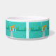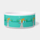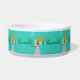 This Space Age Cartoon House Ceramic Dog Bowl is a retro lover’s dream come true. The minimalist art design features an aqua stone house with large, peacock blue windows. Hanging from the atomic, slanting, orange roof, a yellow sputnik light fixture illuminates the front door. The recessed red front door with starburst doorknob is beautifully offset by the vertical green wood planks of the exterior entryway. A grey stone path cuts across the pristine lawn, which appears turquoise in the moonlight. Behind the house, a row of a tall, thin, trees point to the turquoise sky and the white silhouette of a full moon. While no people are visible, on a night like this, the kitschy house’s inhabitants are probably inside watching news footage of the astronauts.