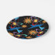 The fun and colourful pattern embellishing this paper plate is an update of classic Mid Century Modern Atomic Age motifs of the 1950's and 1960's, featuring abstract orbiting spheres, rocket ships, and starbursts in a variety of colours.