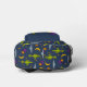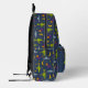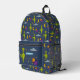 Create an out-of-this world personalized backpack. Illustrations of little green space aliens, flying saucer, moons, stars and planets are set against a navy blue background. The front pocket has a spot to add a name in light blue lettering.