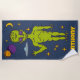 Create an out-of-this-world personalized gift. This beach towel features illustrations of lime green space aliens, a ufo or flying saucer, stars, moons and planets and is ready to be personalized with a name.