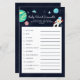 Cute space theme baby shower baby word scramble card featuring illustration of planets, astronaut, and stars. The list of words on this card are all related to babies and they are scrambled. The guests are going to compete who can unscramble all of them first! ANSWER KEY: 1. car seat 2. milk 3. playpen 4. pacifier 5. diaper 6. rocking chair 7. nursery 8. baby monitor 9. swaddle 10. formula 11. rubber ducky 12. stroller.