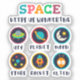 Playful space themed artwork made for curious kids and young students. Cute symbols like UFO, planet, moon, stars, rocket and alien help children explore space science and basic astronomy in a fun and friendly way.