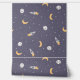 Cute and funny space design with colourful moons, rockets, planets and stars on a blue purple background. Perfect for a boys room, nursery or a playroom.