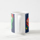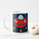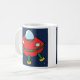 Mug with two cartoon illustrations, one of a rocket ship and one of a flying saucer